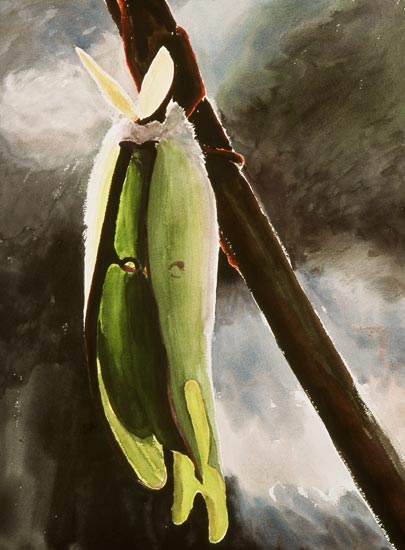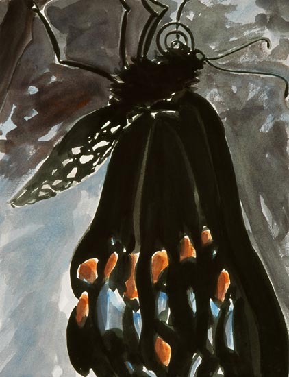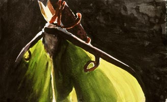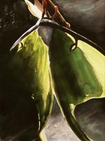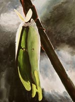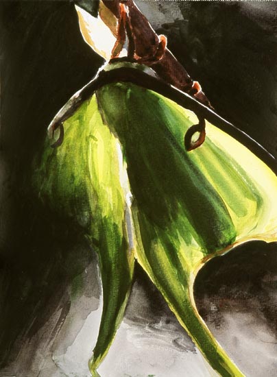 I fell in love with moths as a child, finding them like magical messengers drawn to our light from another realm, especially the ones that appeared suddenly out of complete darkness with their hidden flashes of color. The luna is perhaps the most astonishing, with its otherworldly hue, brief life span and rare appearances. Over the last two years I raised lunas inside my studio’s bay window in order to capture something of their mysterious poetry.